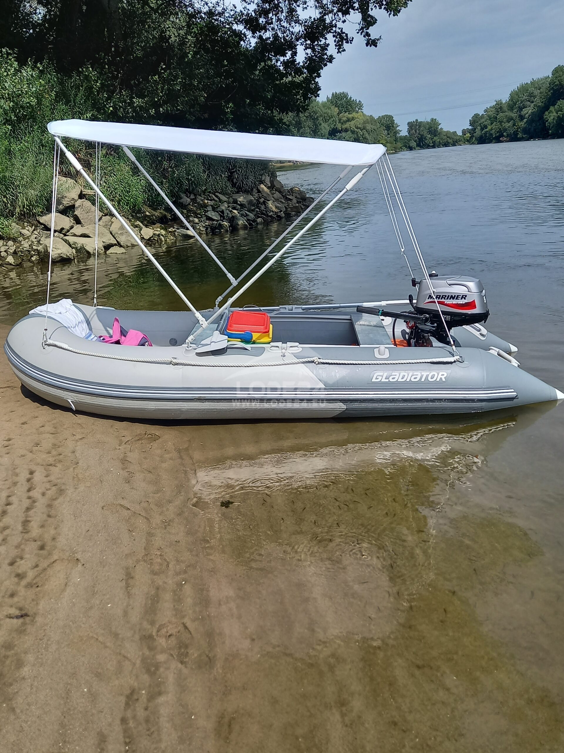 for sale Gladiator 330 to 440 kg + Mariner engine, benz. tank, Bimini anchor on the engine is 20 engine hours